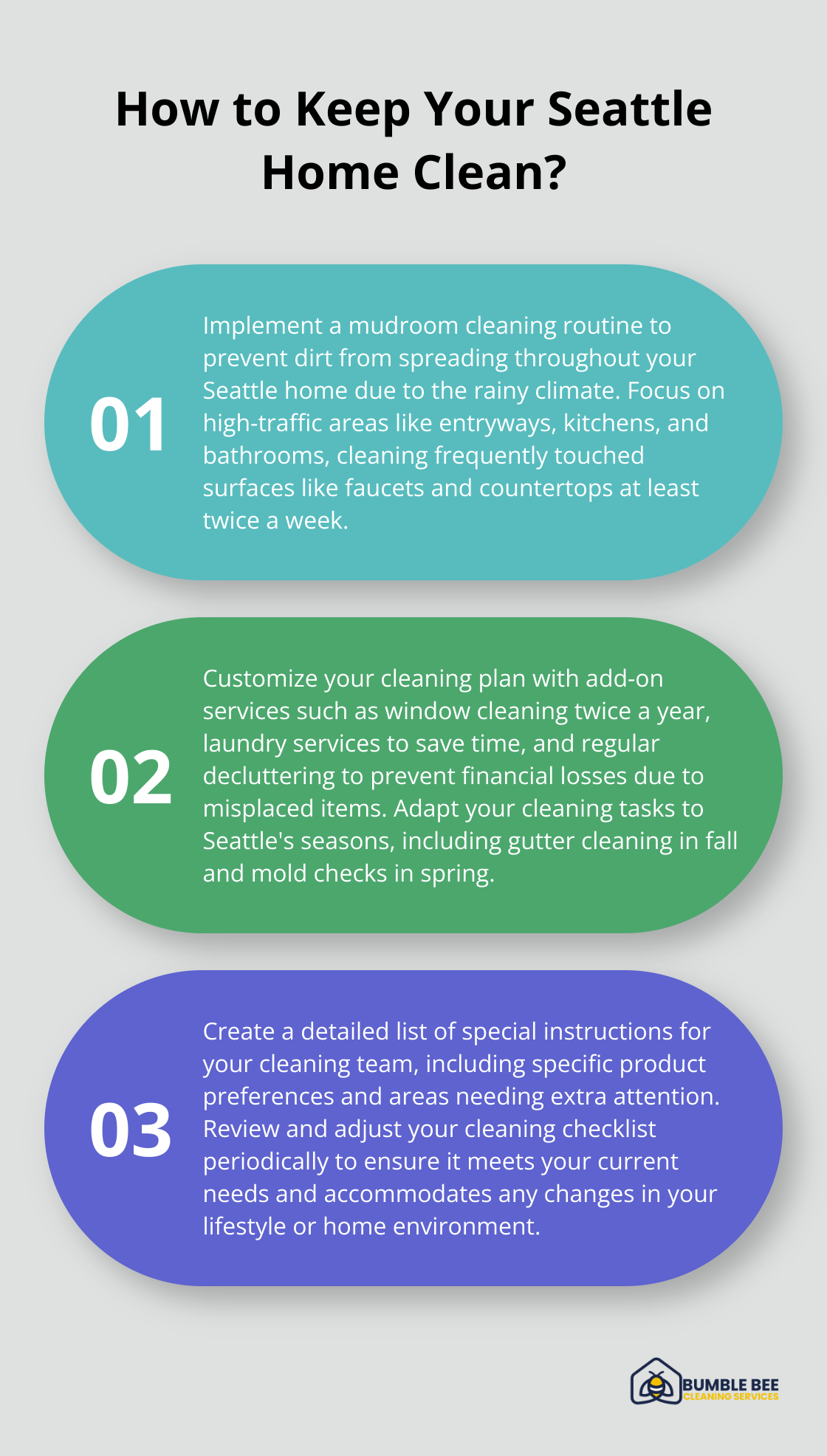 Consider adding specialized tasks to your cleaning routine. Window cleaning can make a significant difference in Seattle’s often overcast environment. The National Association of Home Builders suggests cleaning windows at least twice a year, but Seattle’s rainy season might necessitate more frequent cleanings.