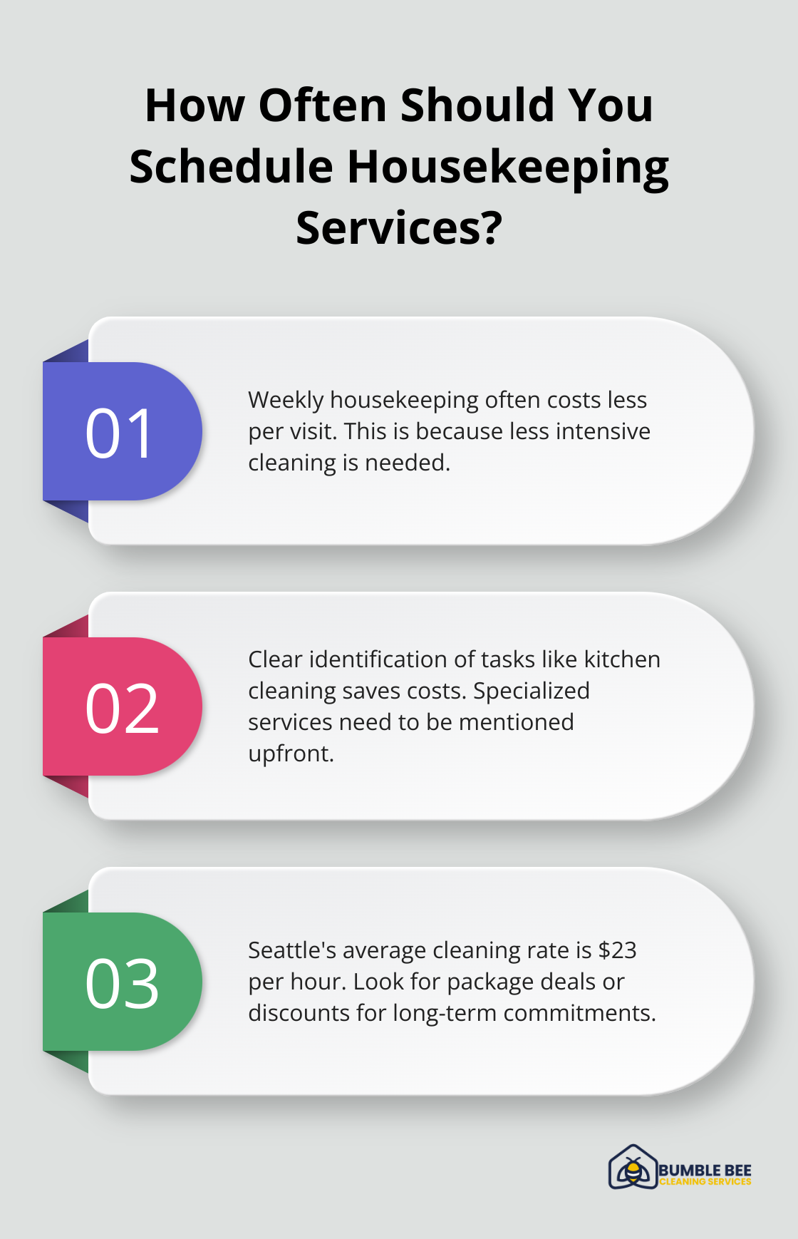 In summary, finding affordable housekeeping services in Seattle involves understanding your specific needs, setting a clear budget, and researching various options to find the best value. Prioritizing reviews, service packages, and verifying licensing and insurance are key steps in ensuring you get reliable and cost-effective services. Opting for basic cleaning, hiring independent cleaners, and scheduling during off-peak times can further help in reducing your expenses.